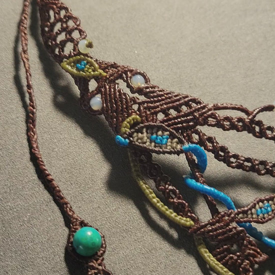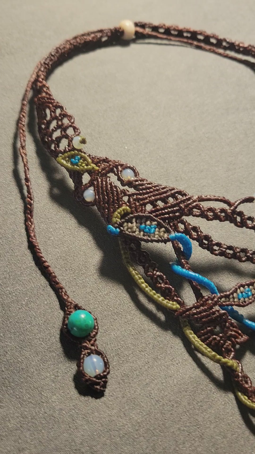 I designed this statement necklace to feel both luxurious and grounded. The breastplate-style macramé creates a bold silhouette while still remaining organic and wearable. Adjustable with a sliding bead and tie in the back, I can wear it comfortably with a sundress at the beach, to a music festival, or anywhere I want a piece that feels expressive, elegant, and deeply connected to the sea.