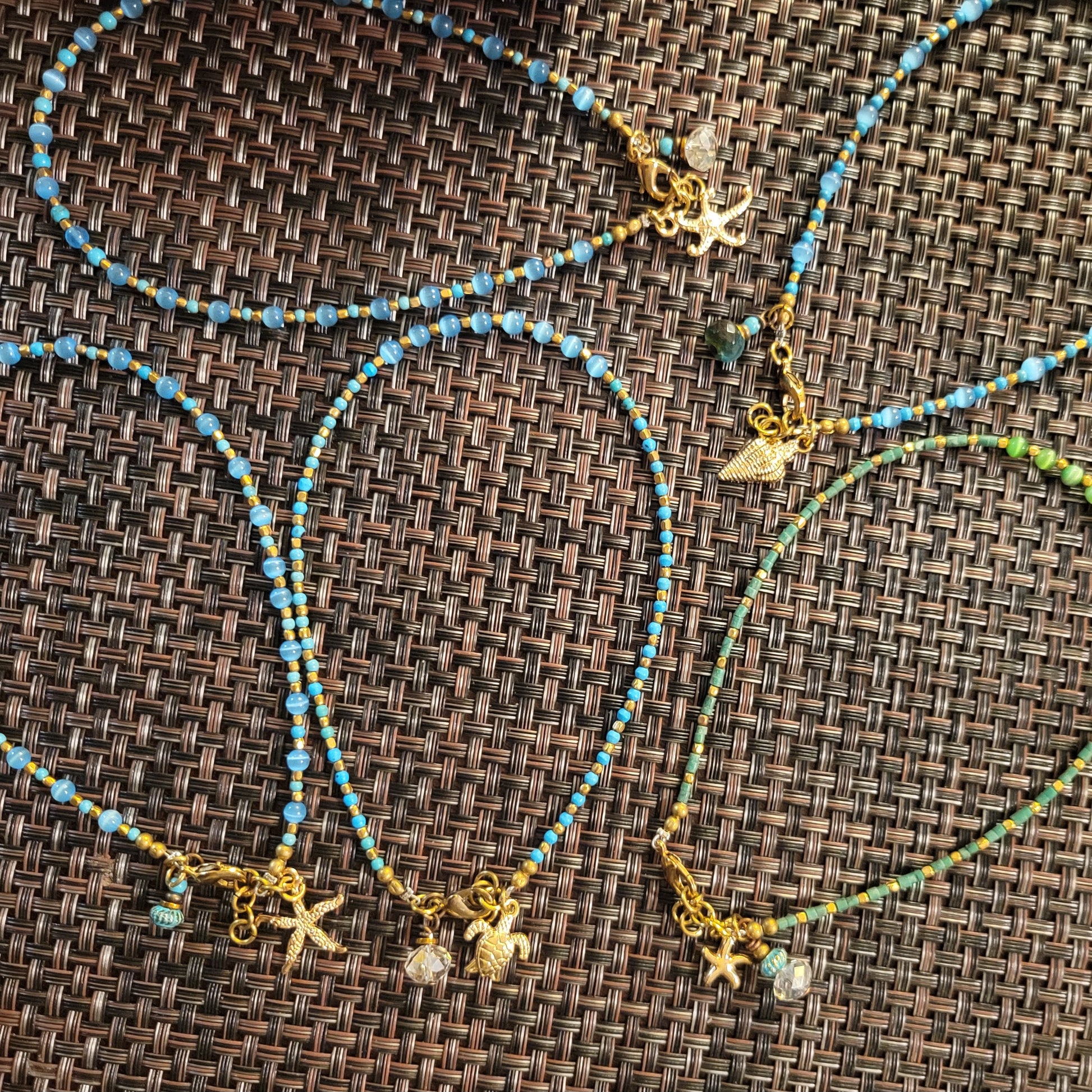 These boho anklets are playful, ocean-inspired accessories that I designed to capture the carefree feeling of sun, salt air, and sandy feet. Each anklet is made with a mix of colorful cat’s eye stone beads, warm brass accents, and ocean charms like sea turtles, sea stars, and seahorses. A natural cowrie shell ties the design back to the shoreline and adds a timeless coastal touch.