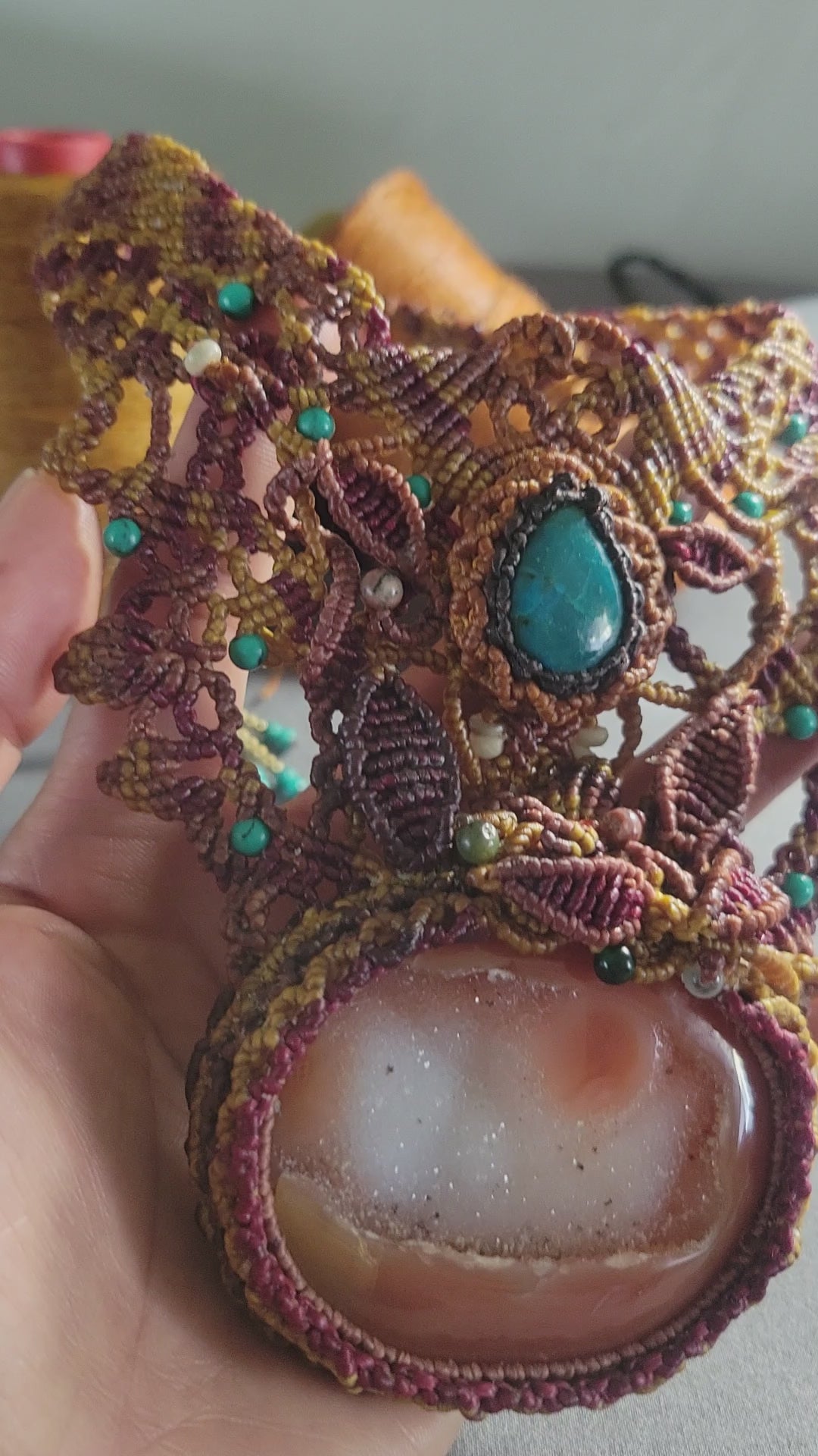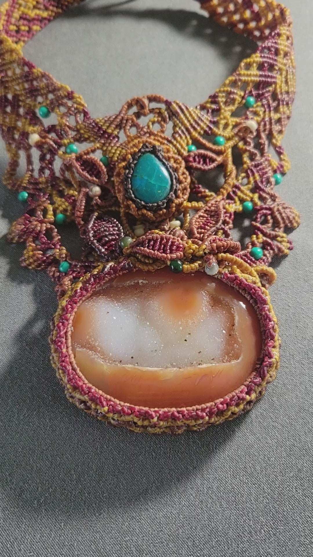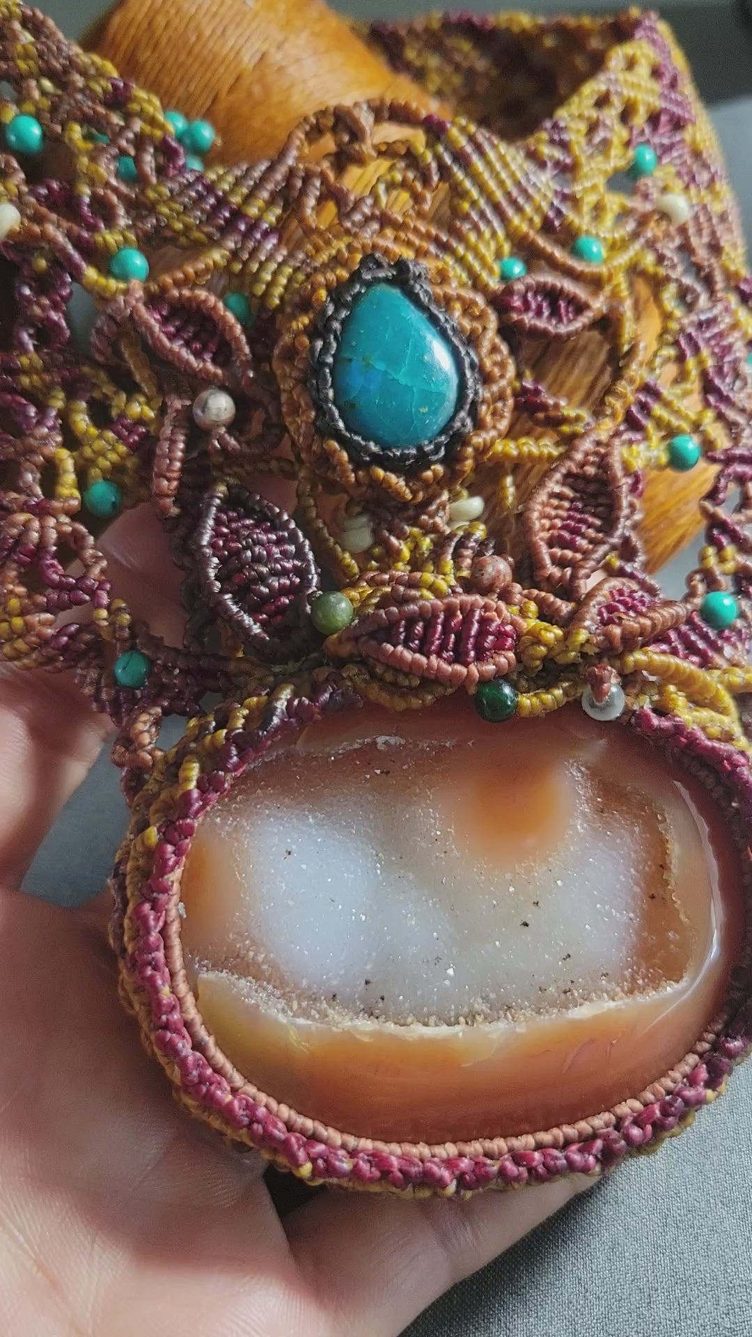 I spent over two days weaving this piece, building a dense and intricate macramé structure that forms a chestplate-like design across the neck and upper chest. Every knot was placed with intention, creating a pattern that feels both ancient and expressive. Carnelian is often associated with vitality, courage, and creative energy, while chrysocolla brings a calming, balancing presence—together forming a dynamic and harmonious pairing.
