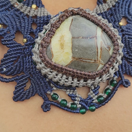 This Dragon Stone choker embodies the essence of strength, grace, and protection. The large ocean jasper pendant glows with deep red, brown, and ivory tones—its patterns swirling like fire and wind beneath the skin of the Earth. The dark blue and grey macramé weave forms the shape of dragon wings along the neck, a symbol of transformation and courage for the modern warrior woman.