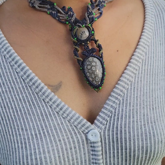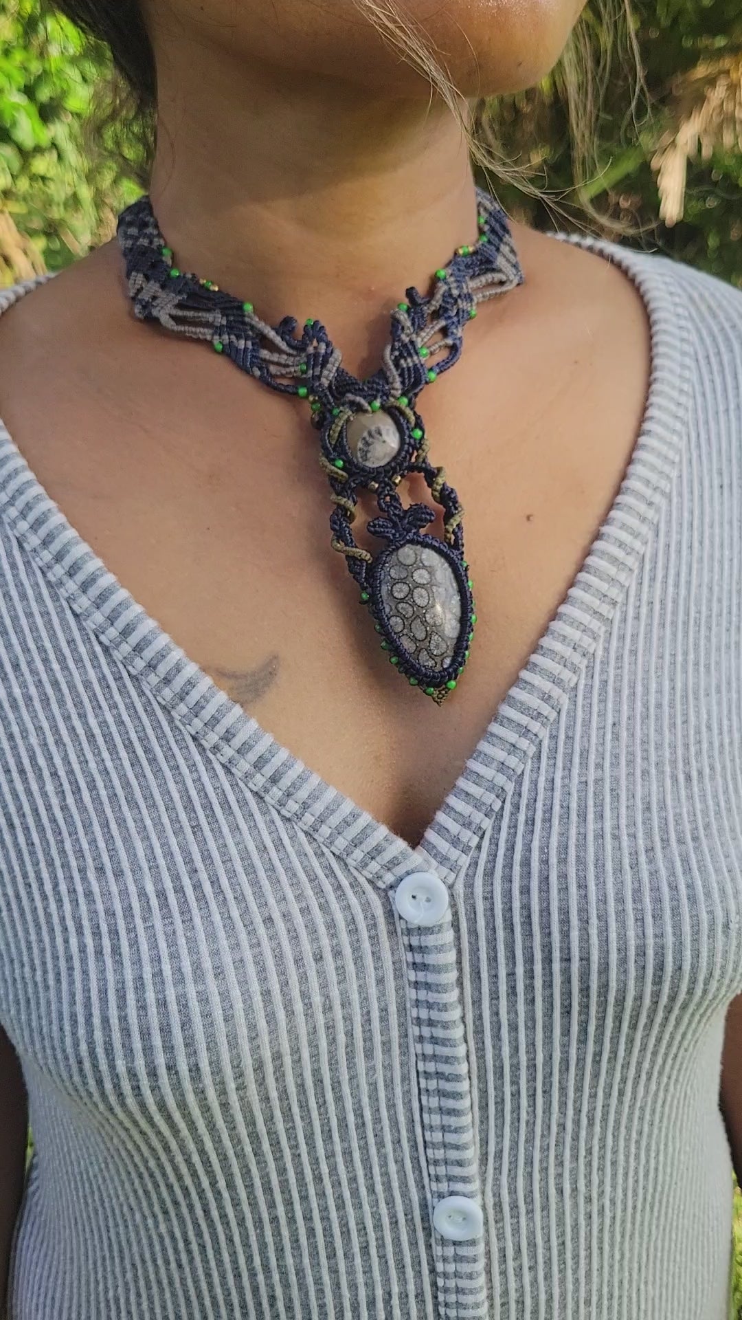 Suspended on an intricately knotted blue and black macramé choker, this piece is a wearable work of art. The interwoven cords form hypnotic geometric patterns, each knot speaking to the craftsmanship and spiritual intention behind this handmade boho piece.