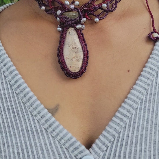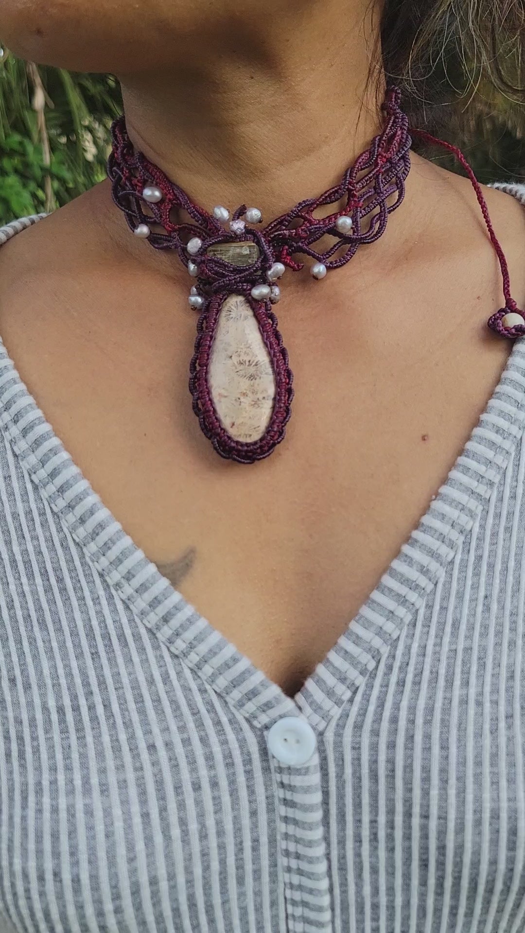 This fossil jewelry piece captures the eternal beauty of the sea, combining fossilized coral, luminous pearls, and radiant quartz in a darkly enchanting macramé choker. The interwoven purple and black cords form a striking contrast against the pale stones, creating an aura of sophistication and mystique.