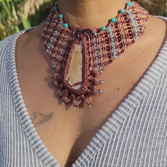 The pendant hangs from a wide-band macramé choker crafted from warm brown and beige waxed cord. The band is detailed with interwoven stone beads in rich blue and black tones, alongside antique brass beads that add a touch of rustic elegance. Every knot and strand speaks to the artistry behind this piece of handmade boho jewelry.