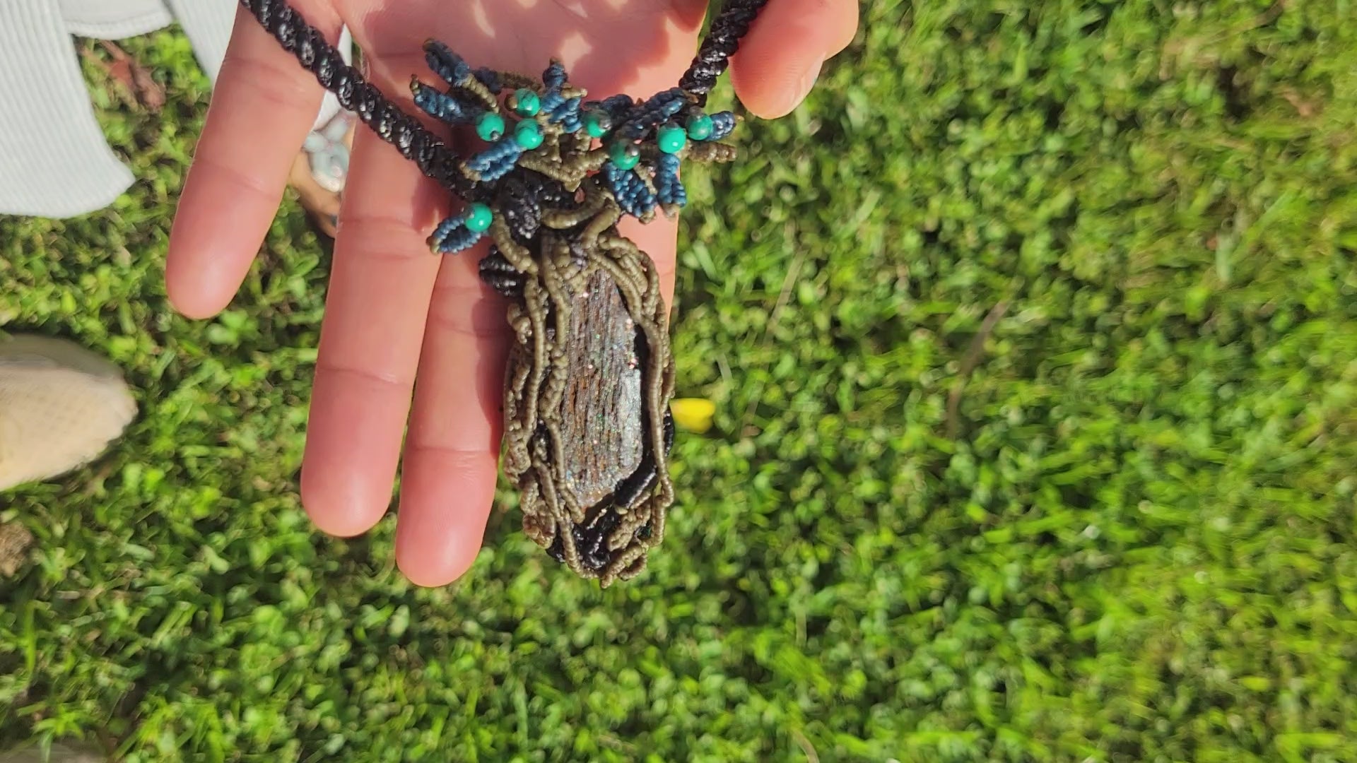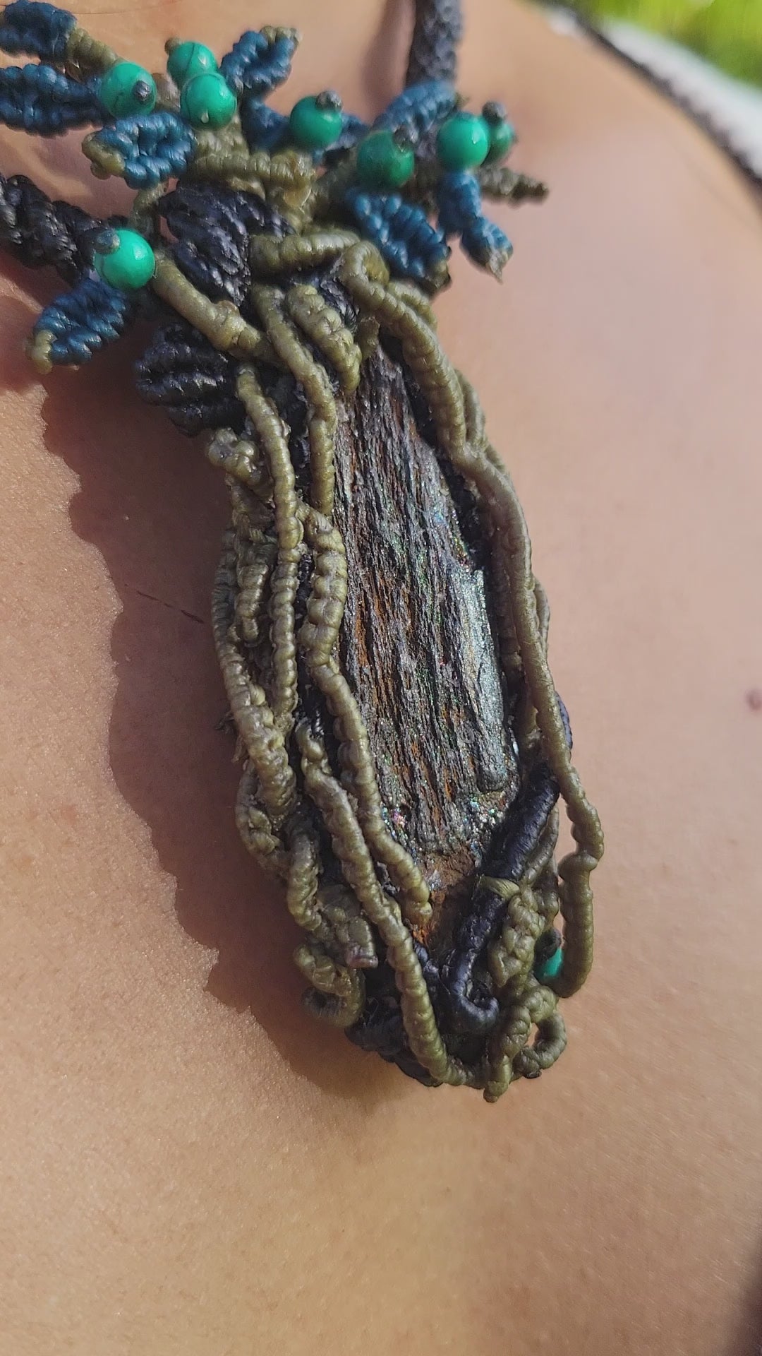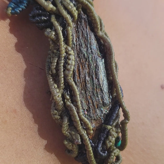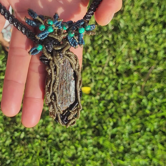 - Pendant: Natural hematite stone wrapped in forest-inspired macramé