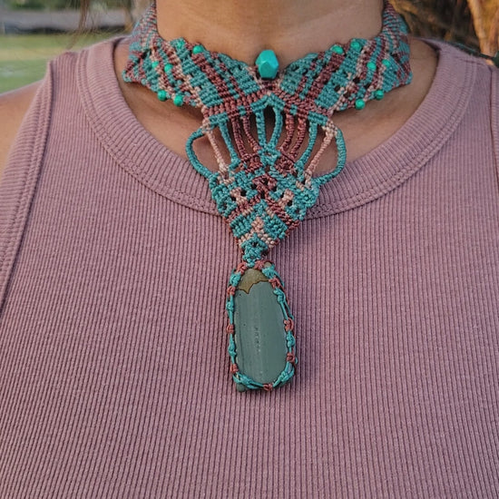 This jasper stone jewelry piece captures the meeting point of land and sea. At its center hangs a stunning picture jasper pendant, its natural patterns resembling desert cliffs, drifting sands, and distant shorelines. The stone is framed by an intricate macramé choker woven in warm tan and refreshing aquamarine cord—colors that echo sunlit beaches and clear coastal waters.