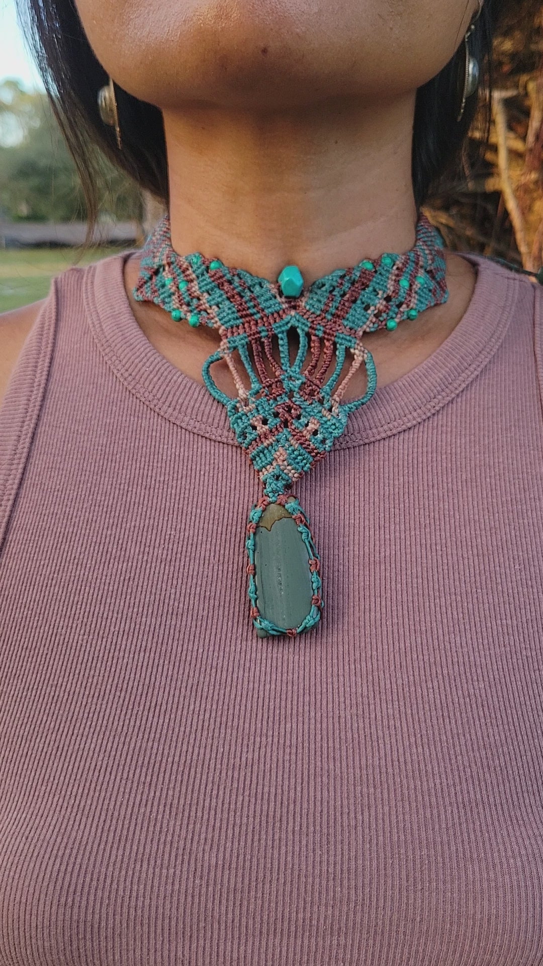 - Design: Macramé choker woven in tan and aquamarine cord
