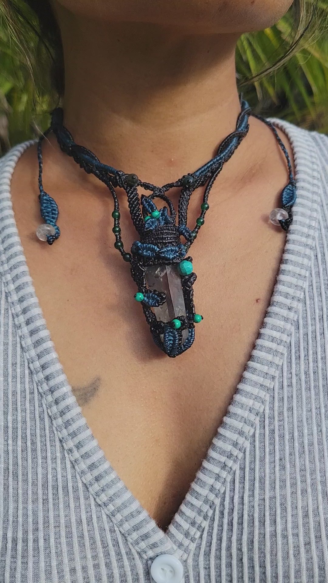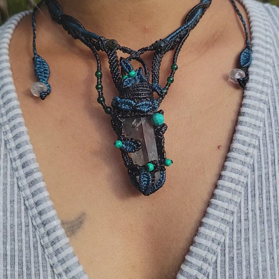 This quartz necklace channels the wild beauty of nature through crystal and cord. A large quartz spear pendant glows at its center, wrapped in dark macramé threads and crowned with turquoise-hued beads and delicate blue leaves. The earthy tones of brown and black meet the shimmer of sky-blue detail—balanced, grounded, and quietly luminous.